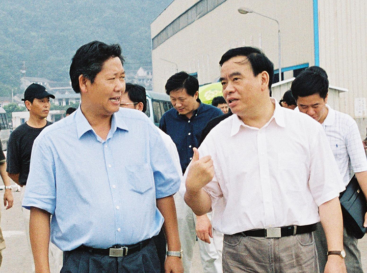 2003年8月8日,浙江省委副書(shū)記、省長(zhǎng)呂祖善(右一)來(lái)“揚(yáng)帆”視察,要求揚(yáng)帆集團(tuán)依托舟山的港口和區(qū)位優(yōu)勢(shì),拓展發(fā)展思路,創(chuàng)新管理機(jī)制,抓住船舶工業(yè)發(fā)展的有利機(jī)遇,進(jìn)一步做大做強(qiáng)。